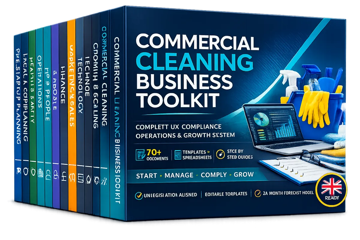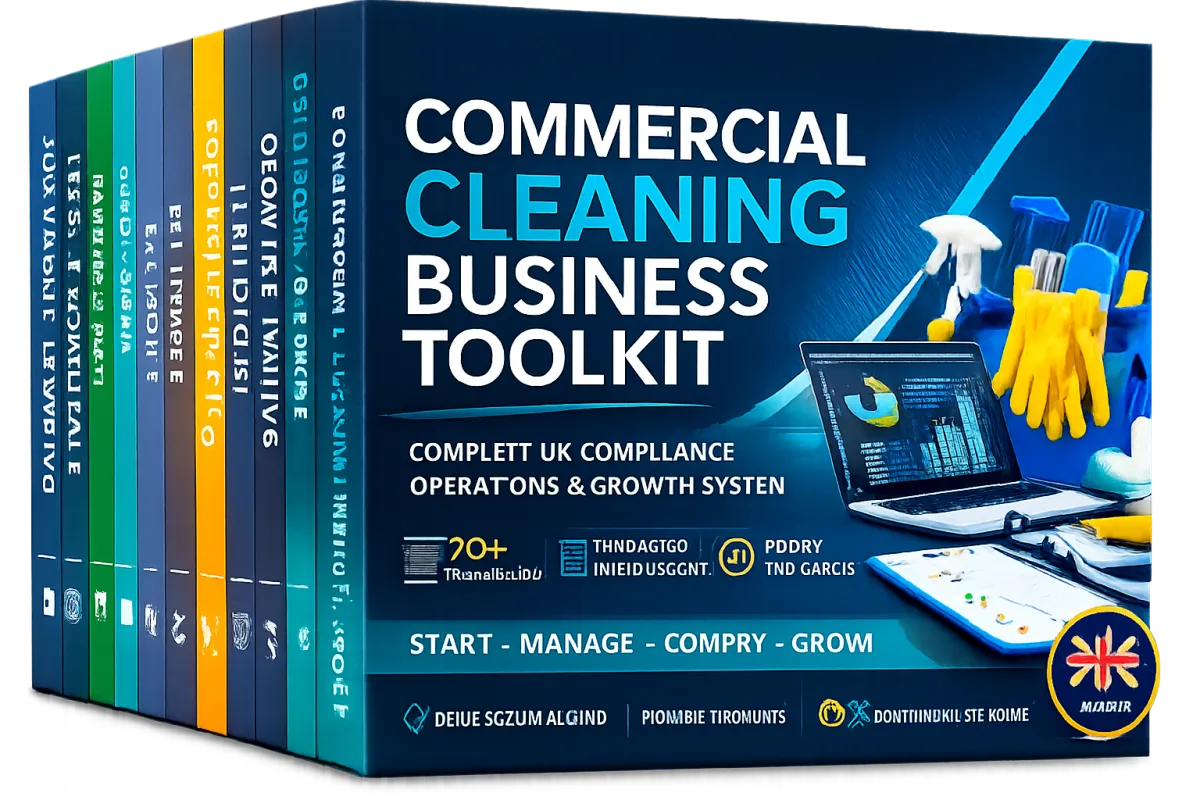 The Cleaning Business Toolkit gives you every document, template, spreadsheet and the system you need to launch and run a UK commercial cleaning company. Not generic business templates. Not American compliance guides. Every file is written for UK regulations, UK terminology, and the commercial cleaning industry specifically.